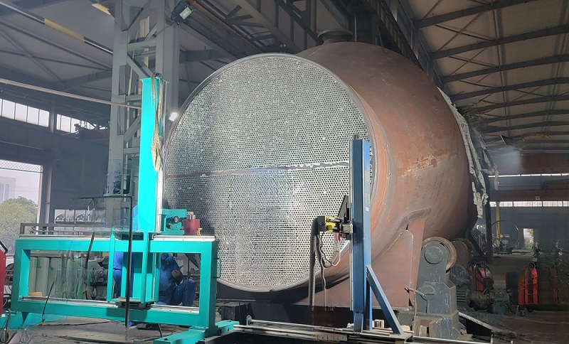 E2601液氨蒸發(fā)器設(shè)備尺寸為Φ2500/3500×11820cm,單臺(tái)重量達(dá)100多噸。設(shè)備管板采用全位置手工焊,這使得焊接過(guò)程變得復(fù)雜且工作量巨大。在焊接過(guò)程中,需要焊接工人具備高超的技藝和豐富的經(jīng)驗(yàn),以確保焊縫的質(zhì)量。焊接工作量大也意味著需要投入更多的時(shí)間和人力成本,這對(duì)項(xiàng)目的進(jìn)度和成本控制提出了挑戰(zhàn)。我司通過(guò)合理的施工組織和管理,有效地提高焊接效率,確保項(xiàng)目按時(shí)完成。