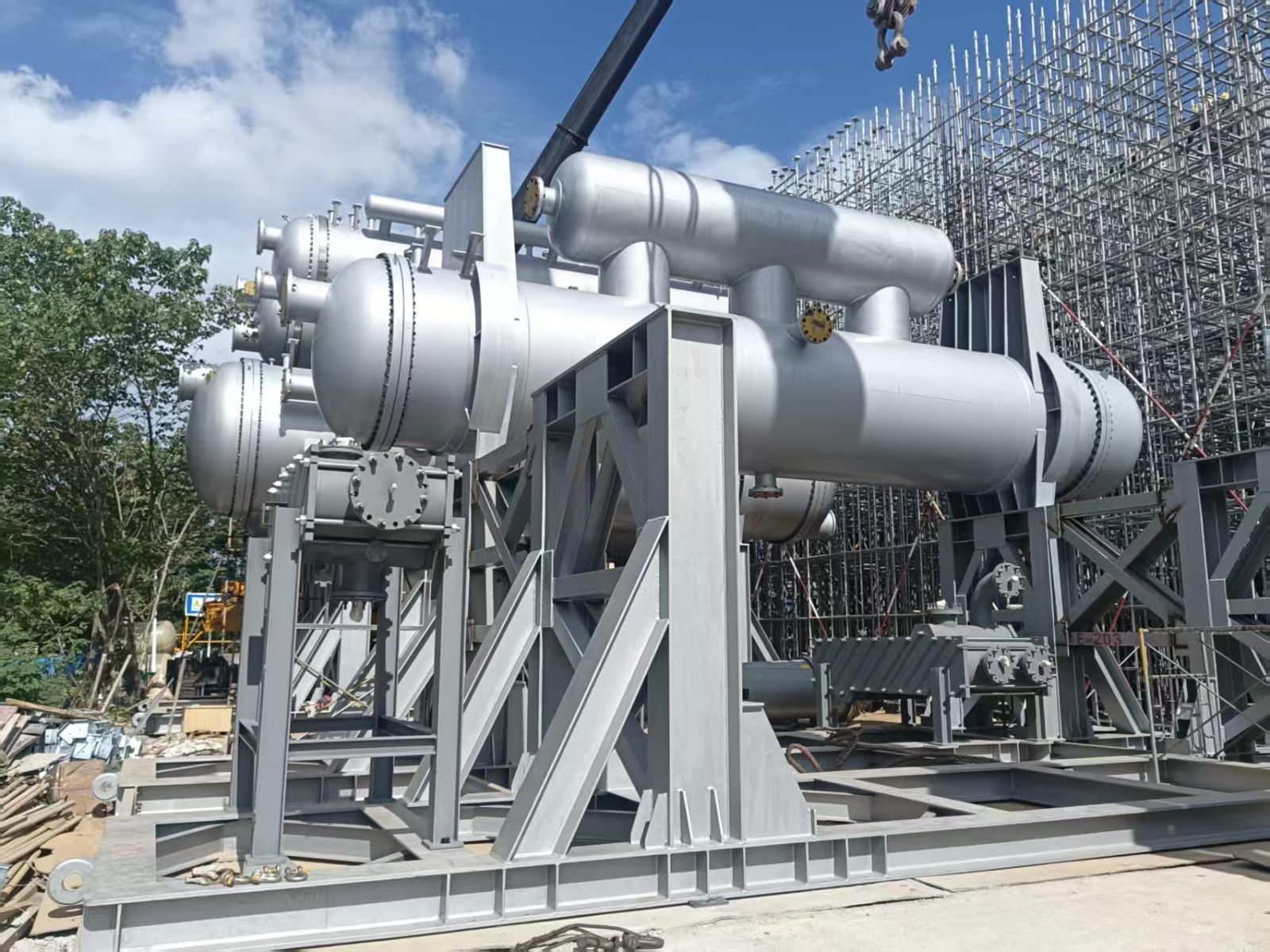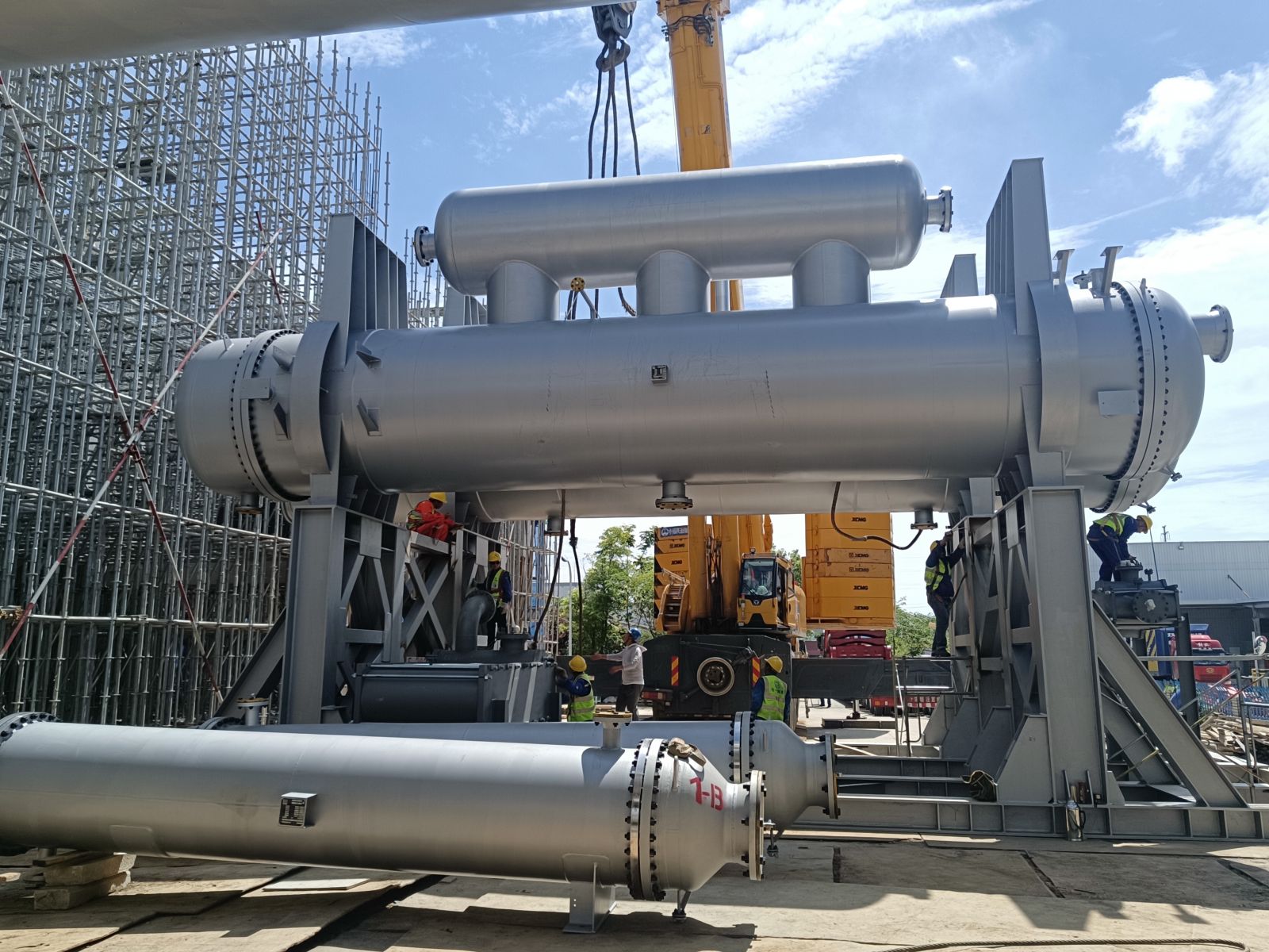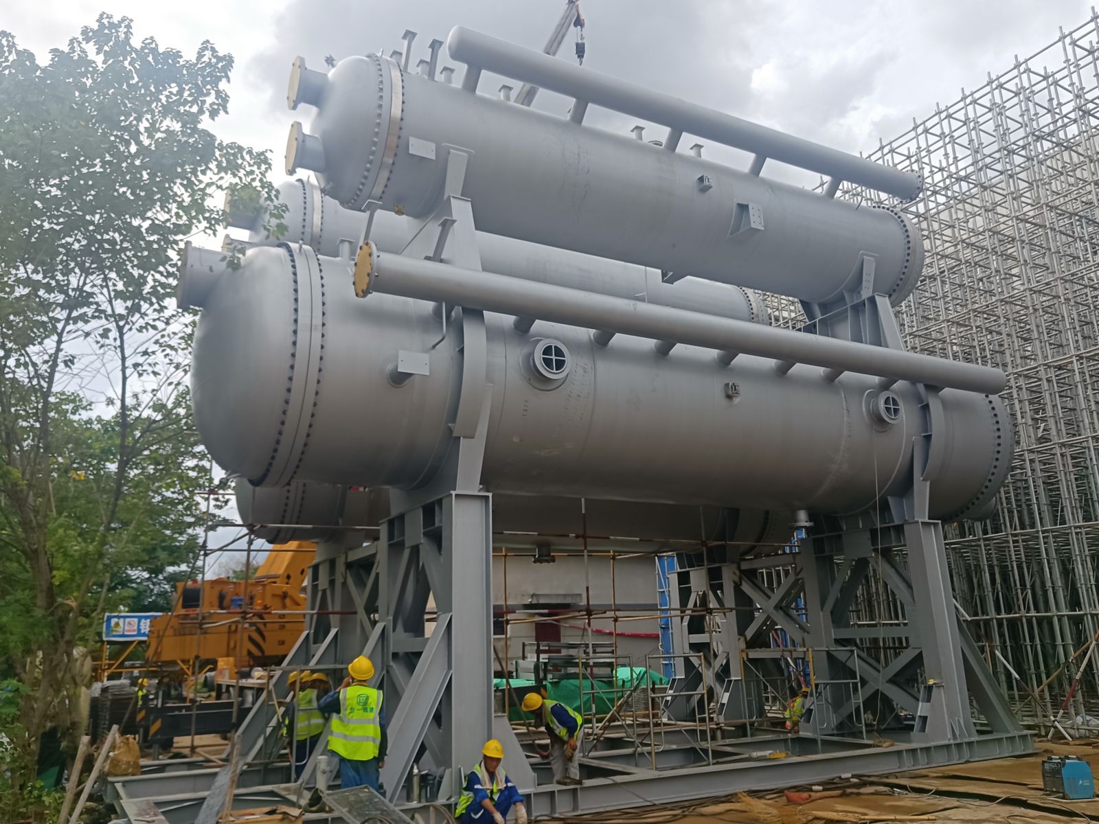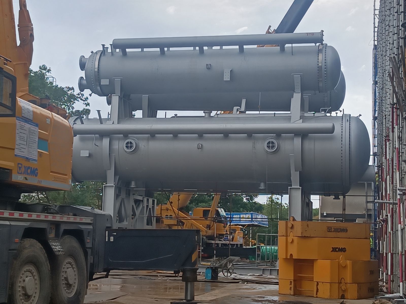 我公司為普泛能源定制的萬千瓦級低品位熱源制冷制冰設(shè)備,現(xiàn)場實現(xiàn)一次吊裝成功。該設(shè)備單套總噸位達500噸,兩套設(shè)備均一次性精準(zhǔn)就位。其可廣泛應(yīng)用于乙二醇、合成氨、綠氨、半導(dǎo)體、電廠等多個領(lǐng)域。